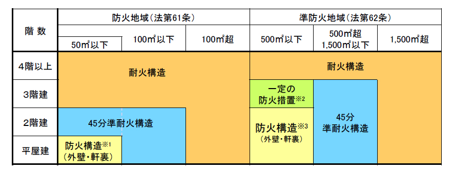 防火地域、準防火地域では階数、延べ面積で制限の区分がされており、下は国土交通省の作成の図をご参照下さい。