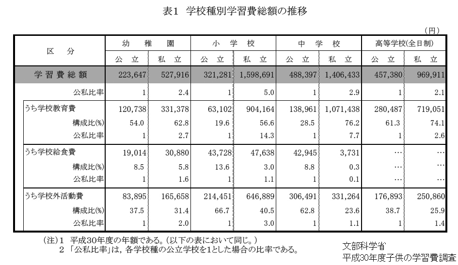 下の表は文部科学省による学習費調査です。