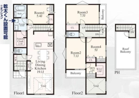 吹抜けのある開放的なリビング!ルーフバルコニー搭載♪駐車スペースは2台駐車可能です◎