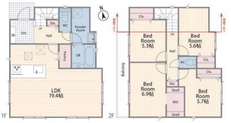 カースペースは2台駐車可能です◎パントリー等収納豊富でお部屋が片付きます♪LDKは19帖以上と広々!