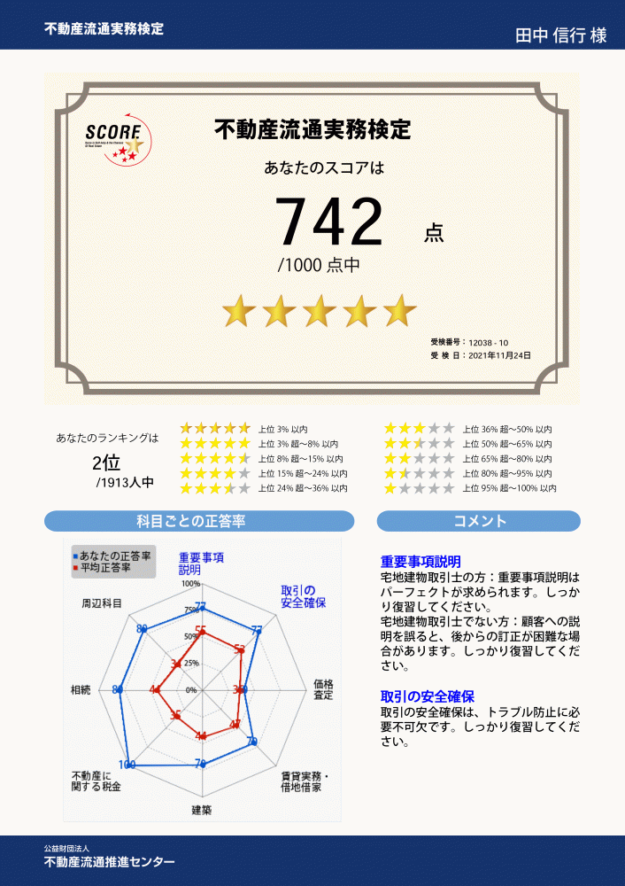 不動産業界に携わり18年を超え、それなりに知識はあると自負もしておりますが、それでもこのスコアを受けたり、色々な研修に参加させて頂いたりする度ごとに、まだまだ知らないことがある、奥が深いと思い知らされる次第です。